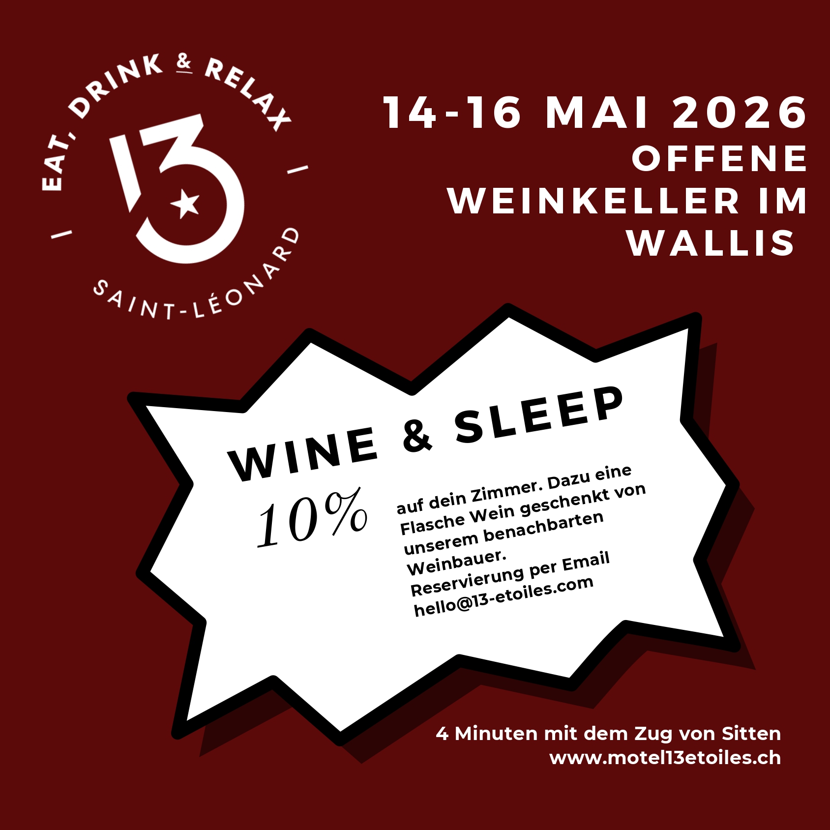 4 Minuten mit dem Zug von Sion entfernt, 10% auf dein Zimmer und eine Flasche Wein geschenkt